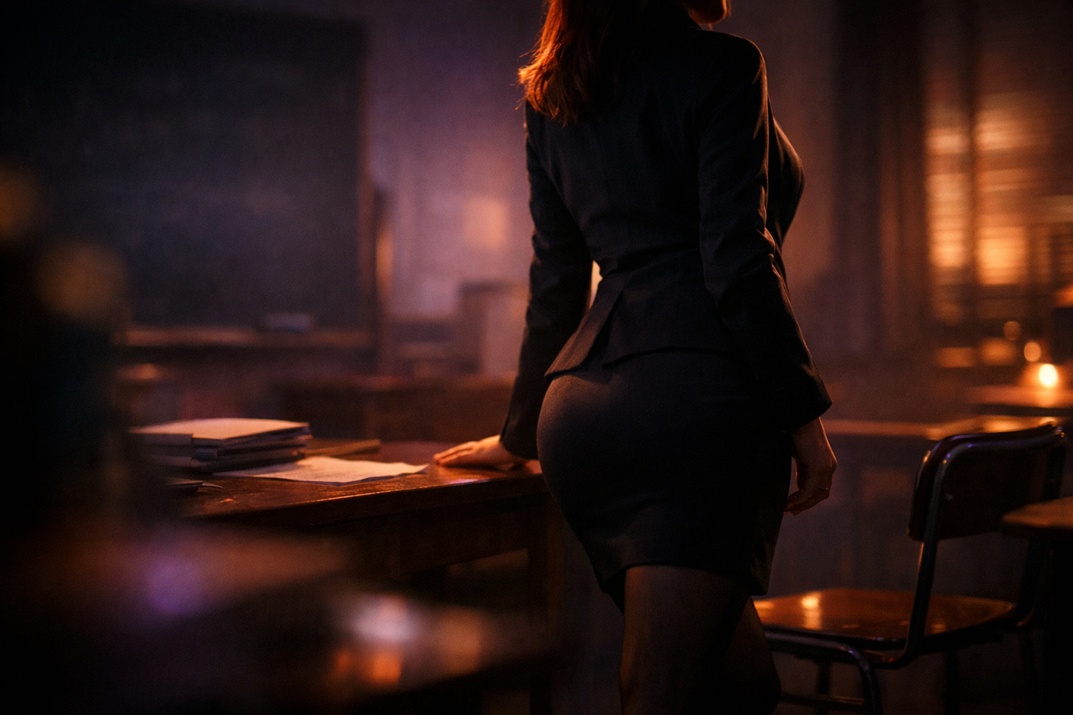 巨乳教師×タイトスカート×パンストという組み合わせは、落ち着いた大人の雰囲気と色気のバランスが魅力です。